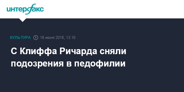 Москва. 16 июня. INTERFAX.RU - Полиция Южного Йоркшира не нашла доказательств причастности легендарного британского музыканта Клиффа Ричарда к сексуальным домогательствам к мальчикам и не будет выдвигать против него обвинений, сообщает The Independent.