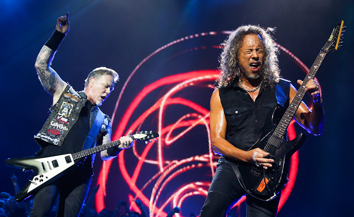 Музыканты группы Metallica во время выступления в спорткомплексе "Олимпийский"