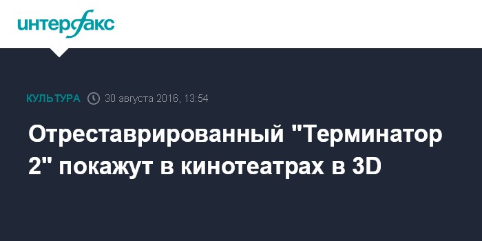 Москва. 30 августа. INTERFAX.RU - Отреставрированную версию фильма "Терминатор 2" покажут на большом экране в 3D, об этом сообщается на официальной странице фильма в фейсбуке.