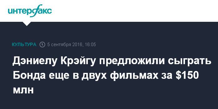 Москва. 5 сентября. INTERFAX.RU - Британскому актеру Дэниелу Крэйгу предложили 150 млн долларов за исполнение роли Джеймса Бонда в двух следующих фильмах франшизы. Об этом пишет издание RadarOnline.