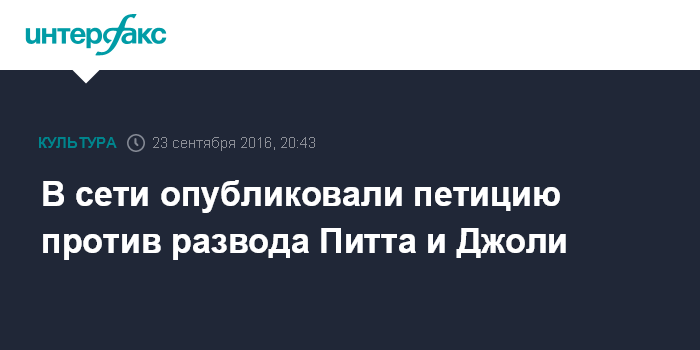 Москва. 23 сентября. INTERFAX.RU - На сайте Change.org опубликована петиция против развода американских актеров Брэда Питта и Анджелины Джоли, о котором стало известно ранее на этой неделе.