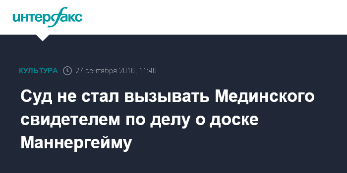 Москва. 27 сентября. INTERFAX.RU - Суд по иску о законности установки доски Карлу Маннергейму в Петербурге отказался вызывать в качестве свидетеля министра культуры РФ Владимира Мединского.