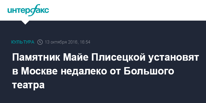 Москва. 13 октября. INTERFAX.RU - Памятник балерине Майе Плисецкой будет установлен в центре Москвы в сквере ее имени на улице Большая Дмитровка недалеко от Большого театра.