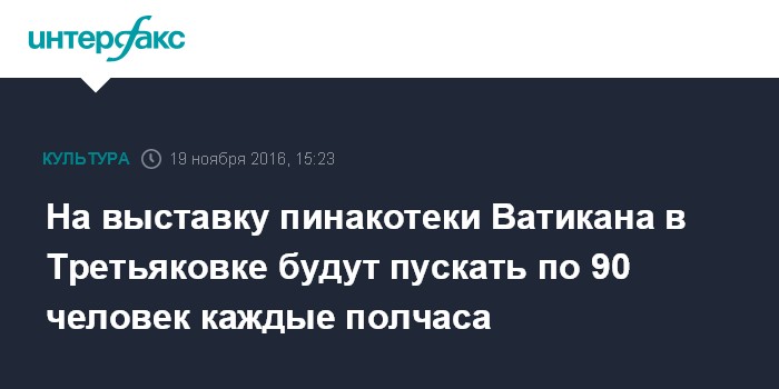 Москва. 19 ноября. INTERFAX.RU - На получасовые сеансы выставки "Roma Aeterna. Шедевры Пинакотеки Ватикана" в Государственной Третьяковской галерее посетителей будут допускать в залы по 90 человек, сообщила генеральный директор галереи Зельфира Трегулова.