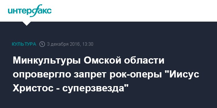 Москва. 3 декабря. INTERFAX.RU - Решение об отмене постановки рок-оперы "Иисус Христос - суперзвезда" в Омске принял прокатчик из-за низкой продажи билетов, сообщил министр культуры Омской области Виктор Лапухин на заседании коллегии Минкультуры РФ в субботу в рамках V Санкт-Петербургского Международного культурного форума.