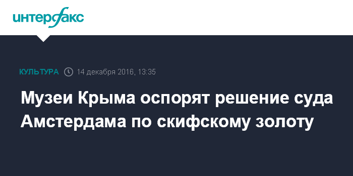 14 декабря было объявлено, что окружной суд Амстердама в среду вынес вердикт о передаче Украине коллекции скифского золота, а не возвращать его в музеи Крыма.