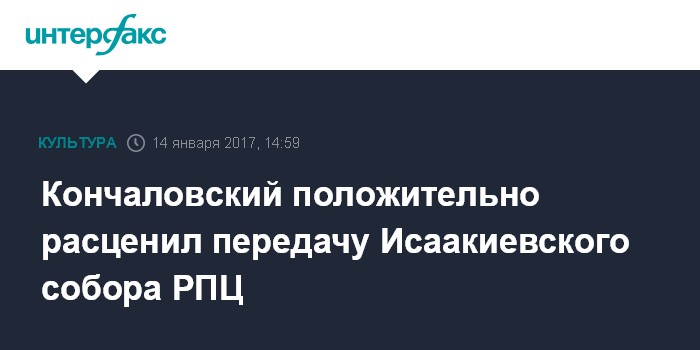 Москва. 14 января. INTERFAX.RU - Режиссер Андрей Кончаловский положительно относится к передаче Исаакиевского собора Русской православной церкви, отмечает, что сущность храма - это не архитектура.