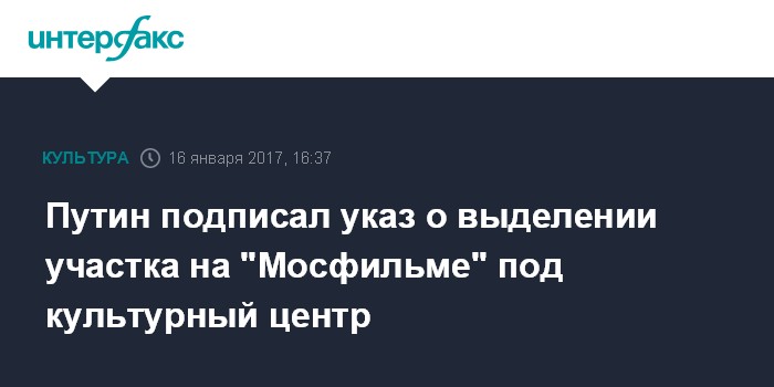 Москва. 16 января. INTERFAX.RU - Президент РФ Владимир Путин подписал распоряжение о предоставлении ООО "Альтера Парк" земельного участка для создания многофункционального производственно-культурного центра на базе киноконцерна "Мосфильм".