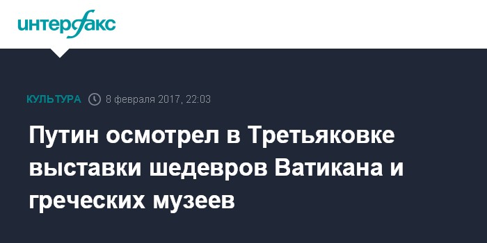 Москва. 8 февраля. INTERFAX.RU - Президент Владимир Путин в среду посетил Третьяковскую галерею, где осмотрел выставку "Roma. Aeterna. Шедевры пинакотеки Ватикана" и "Шедевры Византии".