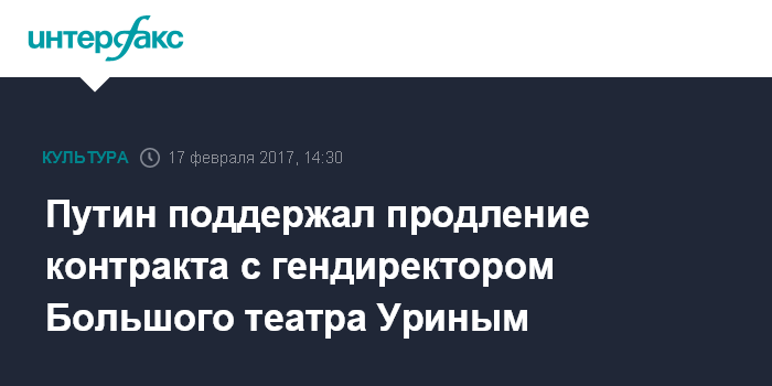 Москва. 17 февраля. INTERFAX.RU - Президент РФ Владимир Путин поддержал инициативу главы Минкультуры Владимира Мединского продлить контракт с Владимиром Уриным в качестве генерального директора Большого театра.