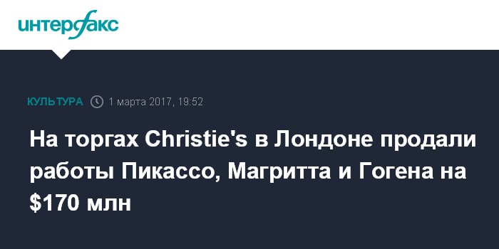 "Суммарная выручка по итогам вечерних аукционов "Искусство импрессионизма и модернизма" и "Искусство сюрреализма", открывших собой Неделю искусства ХХ века Christie's, составила 136,9 млн фунтов стерлингов ($170 млн). Речь идет о 92% проданных лотов или 96% в денежном отношении", - сообщили журналистам в пресс-службе аукционного дома в среду.