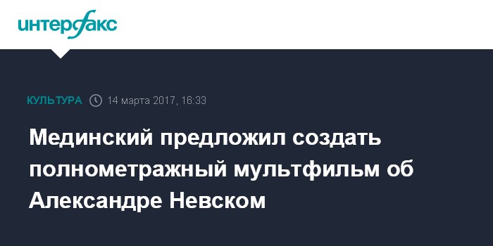 Москва. 14 марта. INTERFAX.RU - Глава Минкультуры РФ Владимир Мединский предложил создать полнометражный мультфильм об Александре Невском в рамках празднования его 800-летия в 2021 году.