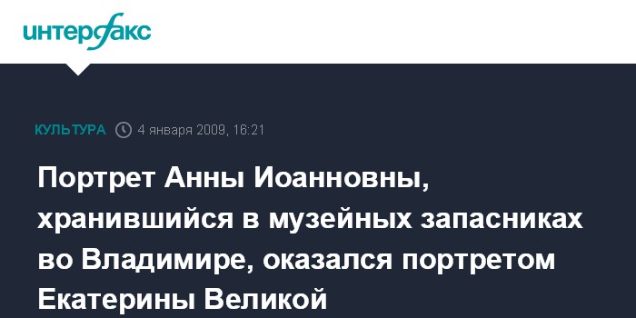 Москва. 4 января. INTERFAX.RU - Портрет российской императрицы Анны Иоанновны, хранившийся в фондах Владимиро-Суздальского музея-заповедника, как оказалось, изображает другую российскую самодержицу - Екатерину II Великую.