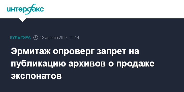 Москва. 13 апреля. INTERFAX.RU - Государственный Эрмитаж опроверг информацию о запрете на публикацию архивных материалов о продаже экспонатов.