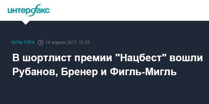Москва. 14 апреля. INTERFAX.RU - В шортлист литературной премии "Нацбест" вошли работы семи авторов, в том числе Андрея Рубанова, Фигль-Мигль, Александра Бренера.