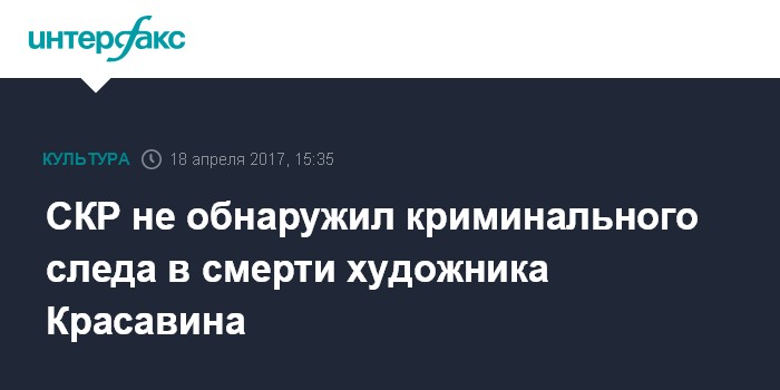 Ранее в СМИ появились сообщения о том, что художник и реставратор картин Алексей Красавин был найден мертвым в своей квартире в Москве. Информированный источник уточнил "Интерфаксу", что, по предварительным данным, причиной смерти художника стала острая сердечная недостаточность.