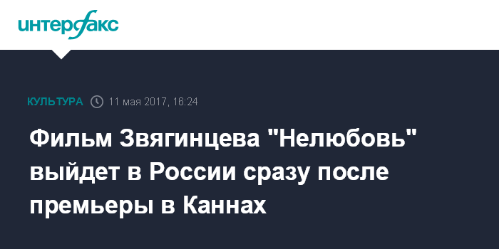 Москва. 11 мая. INTERFAX.RU - Новый фильм Андрея Звягинцева "Нелюбовь" выйдет в российский прокат 1 июня - сразу после премьеры в Каннах.