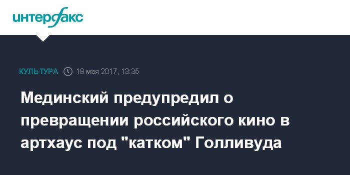 Москва. 19 мая. INTERFAX.RU - Глава Минкультуры России Владимир Мединский заявил, что прокат российских фильмов нуждается в поддержке государства, иначе отечественное кино превратится в артхаус.