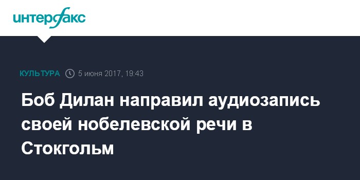Москва. 5 июня. INTERFAX.RU - Американский музыкант Боб Дилан направил в Шведскую академию аудиозапись своей речи в качестве нобелевского лауреата, необходимой для получения денежной премии в 8 млн шведских крон (840 тыс. евро), говорится в заявлении Шведской академии, распространенном в понедельник. "Когда я получил эту Нобелевскую премию по литературе, я задался вопросом, как мои песни связанны с литературой", - сказал Дилан в этой речи.