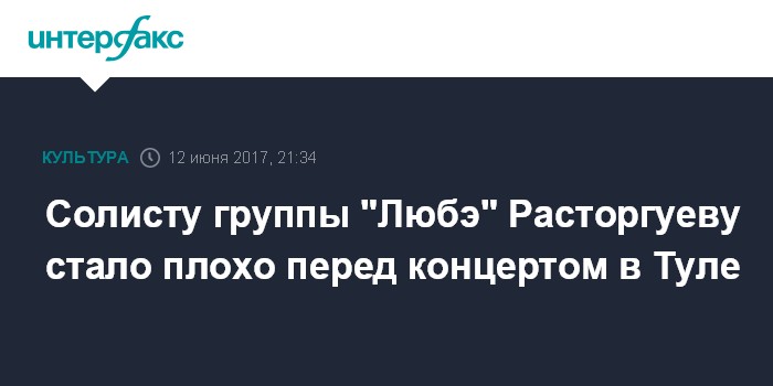 Москва. 12 июня. INTERFAX.RU - Солист группы "Любэ" Николай Расторгуев не смог выступить на праздничном концерте в Туле из-за того, что плохо себя почувствовал перед выходом на сцену, сообщил "Интерфаксу" осведомленный источник.