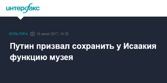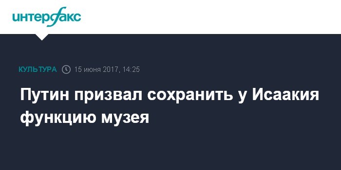 Москва. 15 июня. INTERFAX.RU - Вопрос передачи Русской православной церкви Исаакиевского собора в Санкт-Петербурге необходимо деполитизировать, собор должен сохранить музейную функцию, заявил президент России Владимир Путин.