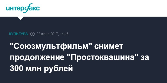 Москва. 22 июня. INTERFAX.RU - Правительство РФ согласовало совершение сделки на создание мультфильма под рабочим названием "Простоквашино" между Союзмультфильмом и "Данон Россия". Согласно распоряжению правительства, опубликованному на официальном интернет-портале правовой информации, размер средств на создание мультфильма составит 300 млн рублей.