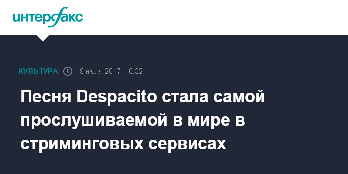 Москва. 19 июля. INTERFAX.RU - Песня Despacito пуэрто-риканского реггетон-музыканта Луиса Фонси при участии вокалиста Дэдди Янки " набрала 4,6 млрд прослушиваний в стриминговых сервисах, став самой прослушиваемой песней в мире, сообщила в среду компания Universal Music Latin Entertainment.