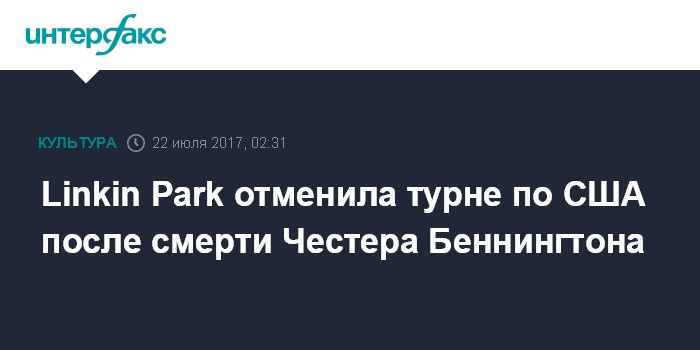 Москва. 22 июля. INTERFAX.RU - Американская рок-группа Linkin Park в пятницу объявила об отмене своего североамериканского турне, сообщает агентство Associated Press. Это произошло после того, как стало известно о самоубийстве солиста Честера Беннингтона.
