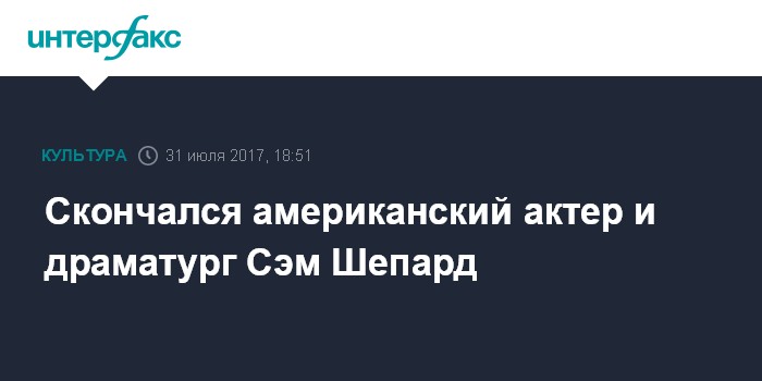 Москва. 31 июля. INTERFAX.RU - Американский актер и драматург Сэм Шепард умер у себя дома в Кентукки на 74-м году жизни, сообщает The New York Times.
