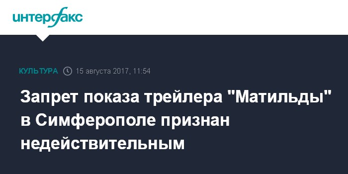 Москва. 15 августа. INTERFAX.RU - Предостережение прокуратуры Симферополя, запретившей кинотеатрам города показывать трейлер фильма Алексея Учителя "Матильда", признано недействительным, сообщил прокурор Крыма Олег Камшилов.