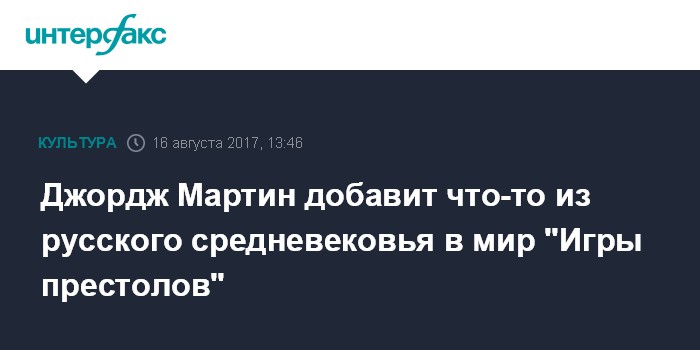 Москва. 16 августа. INTERFAX.RU - Американский писатель-фантаст, автор саги "Песнь Льда и Пламени", по которой снимается сериал "Игра престолов", Джордж Р.Р. Мартин заявил, что готов в будущем "позаимствовать" для своих сюжетов события из российской средневековой истории.