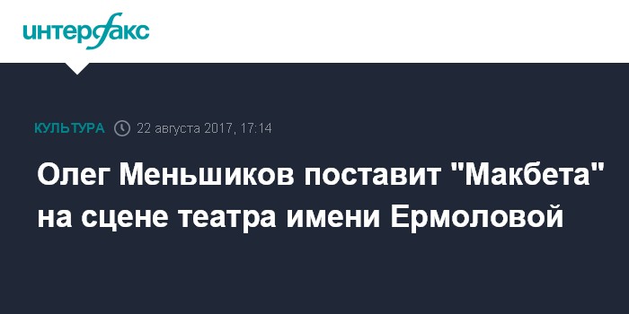 Москва. 22 августа. INTERFAX.RU - Худрук театра имени Ермоловой Олег Меньшиков в новом сезоне поставит "Макбета", также на сцене пройдет премьера "Утиной охоты" и ряд других проектов.