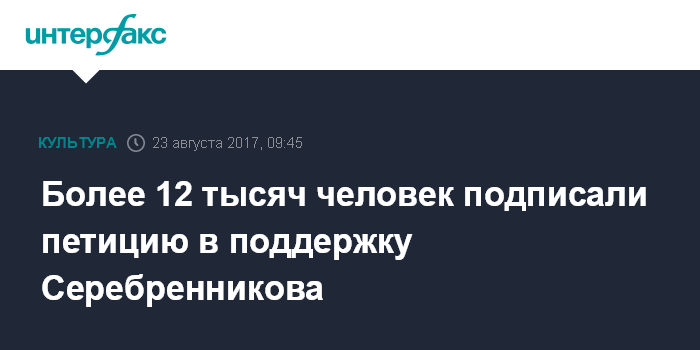 Москва. 23 августа. INTERFAX.RU - Петицию на сайте Change.org с требованием прекратить уголовное преследование режиссёра Кирилла Серебренникова, задержанного накануне по делу о крупном мошенничестве, подписали более 12 тысяч человек.