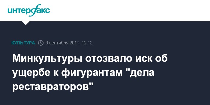Москва. 8 сентября. INTERFAX.RU - Министерство культуры РФ отозвало свой иск о взыскании ущерба с обвиняемых по "делу реставраторов", сообщил "Интерфаксу" в пятницу глава ведомства Владимир Мединский.