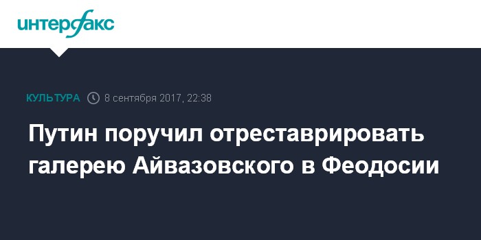 Москва. 8 сентября. INTERFAX.RU - Президент РФ Владимир Путин поручил привести учреждения культуры и объектов культурного наследия, расположенных на территориях Республики Крым и Севастополя, в том числе Феодосийской картинной галереи им. Айвазовского и Алупкинского дворцово-паркового музея-заповедника, в удовлетворительное состояние, сообщает в пятницу сайт Кремля.
