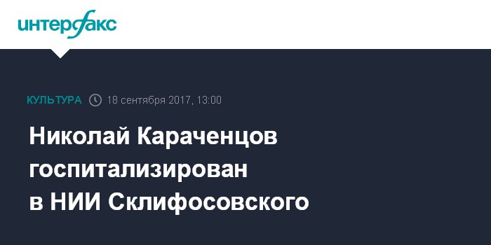 Москва. 18 сентября. INTERFAX.RU - Актер Николай Караченцов госпитализирован в отделение нейрохирургии НИИ Склифосовского, сообщили "Интерфаксу" в понедельник в справочной медучреждения.