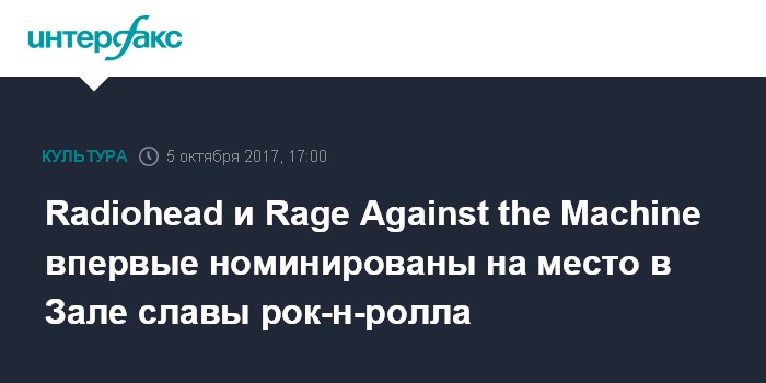 Москва. 5 октября. INTERFAX.RU - Американская рок-группа Rage Against the Machine и британская Radiohead включены в список группа, номинированных на включение в Зал и музей славы рок-н-ролла, которые находятся в городе Кливленде (США, штат Огайо), передают в четверг американские СМИ.