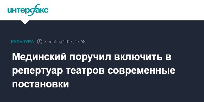 Москва. 3 ноября. INTERFAX.RU - Министр культуры РФ Владимир Мединский поручил вернуть в государственное задание федеральным театрам пункт о наличии новых и современных постановок.