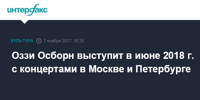 "Сам "крестный отец" хэви-метала в начале лета 2018 года посетит Россию. Оззи Осборн выступит с большими концертами в рамках своего прощального мирового тура 1 июня в столичном "Олимпийском" и 3 июня в петербургском "Ледовом дворце", - сообщили "Интерфаксу" организаторы шоу во вторник.
