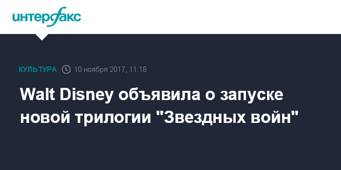 Москва. 10 ноября. INTERFAX.RU - Американская Walt Disney Co., крупнейшая в мире компания в сфере развлечений и медиа, в ночь на пятницу объявила о планах снять очередную, четвертую по счету, трилогию звездной саги "Звездные войны".