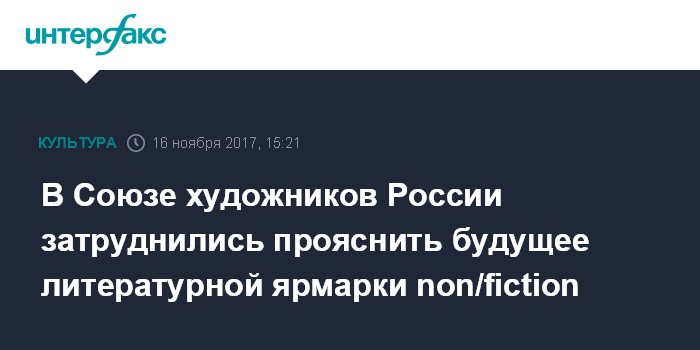 Москва. 16 ноября. INTERFAX.RU - 19-я Международная ярмарка интеллектуальной литературы non/fiction традиционно пройдет в Центральном доме художника (ЦДХ) на Крымском валу, дальнейшая судьба ярмарки пока неизвестна в связи с ликвидацией Международной конфедерации союзов художников (МКСХ), сообщил председатель Союза художников России (СХР) Андрей Ковальчук "Интерфаксу".