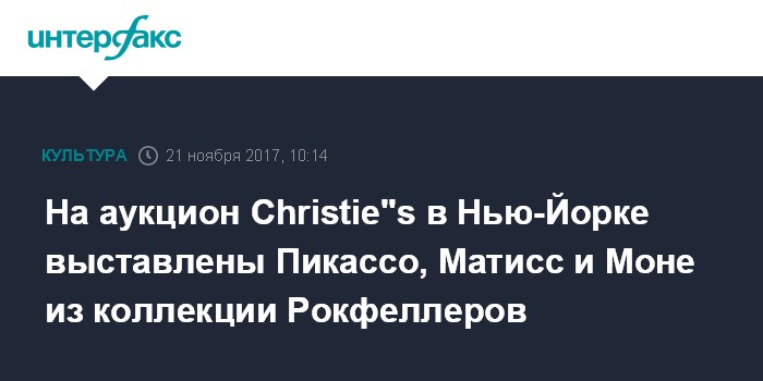 "Аукционный дом Christie's объявляет о том, что отдельные топ-лоты торгов, посвященных коллекции Пегги и Дэвида Рокфеллеров, будут впервые показаны в Гонконге начиная с 24 ноября 2017 года, тем самым открывая мировое предаукционное турне. Собрание будет выставлено на продажу в аукционных залах Christie's в здании нью-йоркского Рокфеллер-центра весной 2018 года. Данные торги обещают стать крупнейшим событием в аукционной истории, в то время как вся выручка будет направлена на поддержку 10 благотворительных организаций", - рассказали "Интерфаксу" в пресс-службе.