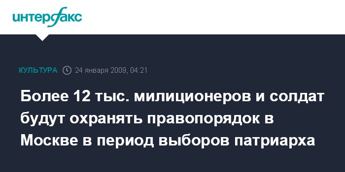 Москва. 24 января. ИНТЕРФАКС-МОСКВА - Во время мероприятий Русской православной церкви по выборам патриарха Московского и всея Руси охрану правопорядка в Москве будут обеспечивать свыше 12 тыс. сотрудников милиции и военнослужащих Внутренних войск.
