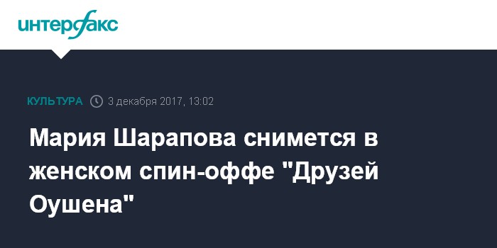 Москва. 3 декабря. INTERFAX.RU - Российская теннисистка Мария Шарапова снимется в женском спин-оффе трилогии "Друзья Оушена", сообщает издание Tennis World. Она появится в качестве камео, то есть сыграет саму себя, в картине "Восемь подруг мисс Оушен" режиссера Гэри Росса.