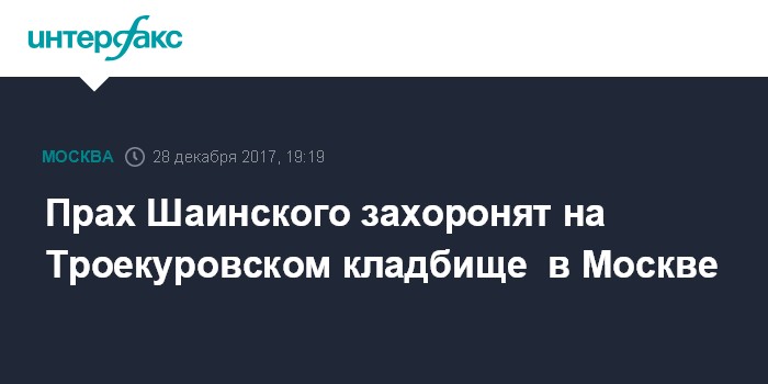 Москва. 28 декабря. INTERFAX.RU - Прах композитора Владимира Шаинского, скончавшегося в США на 93-м году жизни, после кремации будет захоронен на Троекуровском кладбище в российской столице.