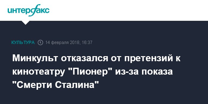 Москва. 14 февраля. INTERFAX.RU - Мировой суд Дорогомиловского района Москвы не стал рассматривать иск министерства культуры к кинотеатру "Пионер" из-за показа фильма "Смерть Сталина" в связи с отказом от претензий, сообщила "Интерфаксу" пресс-секретарь суда Евгения Горохова.