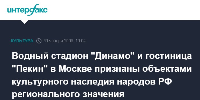 Водный стадион "Динамо" и гостиница "Пекин" в Москве признаны объектами культурного наследия народов РФ регионального значения