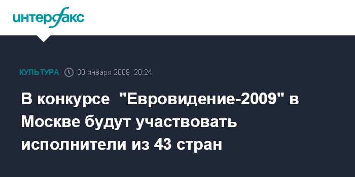Москва. 30 января. INTERFAX.RU - Участниками "Евровидения-2009", финал которого состоится в Москве 16 мая, будут 43 страны, сообщили организаторы конкурса. "Конкурс Песни "Евровидение-2009", который состоится уже в 54-й раз, пройдет в Москве в мае этого года в столичном спорткомплексе "Олимпийский" с участием 43 стран", - говорится в пресс-релизе организаторов.