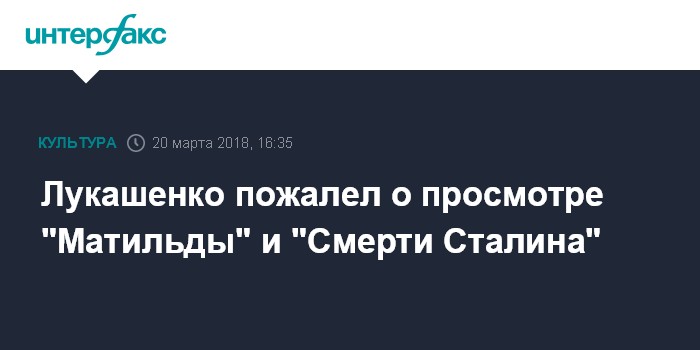 Москва. 20 марта. INTERFAX.RU - Президент Белоруссии Александр Лукашенко посмотрел из-за поднявшейся "шумихи" фильмы "Матильда" и "Смерть Сталина" и пожалел, что потратил на них время.