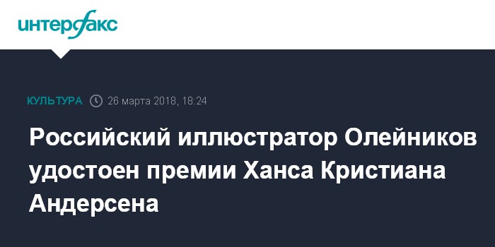 "Сегодня на Международной ярмарке детской книги в Болонье международный совет по детской книге объявил победителей на соискание премии имени Ханса Кристиана Андерсена 2018 года, самой престижной премии в области детской литературы в мире. Им стал современный русский художник-иллюстратор Игорь Олейников", - отмечается в сообщении.